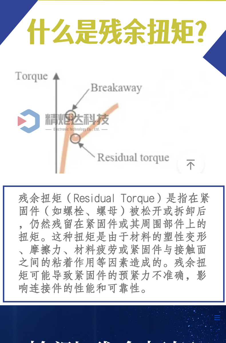 残余扭矩扳手的松脱法,又称松脱检测法:松脱扭矩乘以一个系数,一般1.1-1.2解释:将已经紧固的螺栓,用扭力扳手慢慢使其松开,然后读取其开始转动那一刹那的瞬时扭矩值,此时的扭矩理论上应该是峰值,继续扭动的数值都会小于这个峰值。这个峰值还不是我们想要检测的残余扭矩,因为经验发现,这个值和真正的残余扭矩相比偏小,所以通常会把这个值乘以一个系数,约为1.1至1.2之间,根据实际情况调整。计算以后的数值我们认为才是我们想要的残余扭矩。3.松-紧法:检验前先在被检螺栓或螺母头部与被连接体上划一道线,确认相互的原始位置。然后将螺栓或螺母松开些,在用扭矩扳手将螺栓或螺母拧紧到原始位置,这时的最大扭矩值再乘以0.9~1.1所得的值即为需要的残余扭矩。解释:当残余扭矩大于拧紧扭矩时,说明被测紧固处可能被过度拧紧。为避免过度拧紧的风险,采用松-紧法。不适宜有防松功能的紧固件。